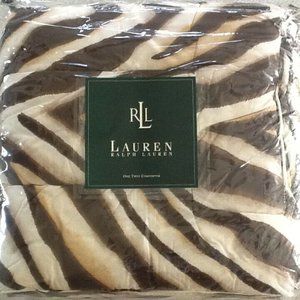 Ralph Lauren "Zanzibar Grassland Zebra Collection" Twin Bed Comforter with brown, tan, and ivory zebra pattern. Approximate Dimensions: 66 inches x 86 inches. Fabric Content: 100% Cotton. Sateen-Weave. Machine washable. Condition is new in original retail packaging.