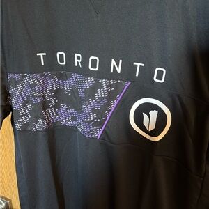 This League jersey features a bold 'TORONTO' design across the chest, complemented by a unique purple and black pattern. Crafted with a classic crew neck and short sleeves, it's perfect for showcasing your city pride in style.