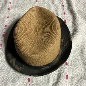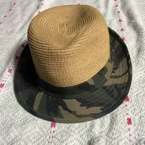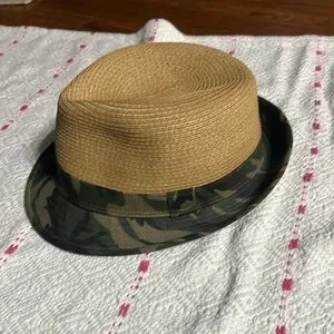 Stylish tan fedora with a camouflage band. Perfect for casual outings.