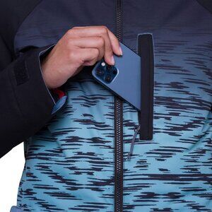 Internal jacquard mesh goggles/storage pocket; full hook-and-loop sleeve pass pocket with key clip; front hand pocket with inner key clip
