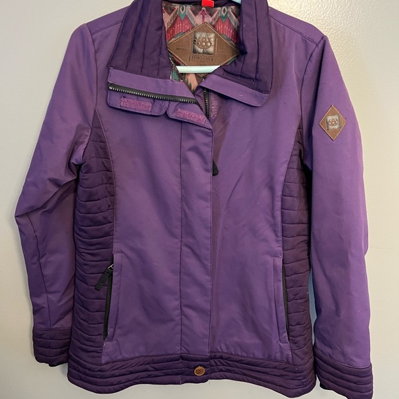 Stylish 686 jacket in purple with a vibrant multicolor pattern. Perfect for outdoor adventures.