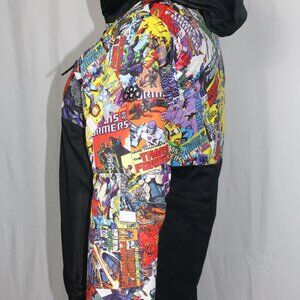A hooded jacket with an upper body and sleeve Transformers comic print. The hood and lower section of the jacket is solid black and able to close with a full zipper closure. Water-resistant material and perfect for snowboarding. Left upper chest outside zippered pocket and two outside zippered pockets on the left and right side of the lower jacket. One inside pocket on the right lower side of jacket, but without zipper.