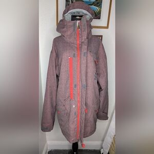 The 686 Winter Coat is a stylish and functional ski jacket designed for men in size Large. Made with 100% polyester flannel in a classic fit, this gray jacket features a bold plaid pattern, perfect for winter sports enthusiasts. With multiple inner and outer pockets, a full zip closure, and a lined hood, this heavyweight jacket offers both comfort and durability for skiing and snowboarding adventures. Stay warm and fashionable in this high-quality winter coat from the brand 686. In excellent condition. Only visible flaw is missing plastic from inner card pocket as shown.