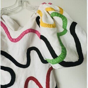 Elegant white dress with bold multicolor accents. Perfect for a statement look.