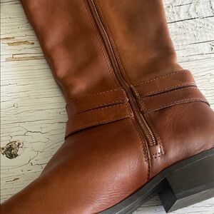 Chic over the knee boots by INC International Concepts. Rich tan color with stylish buckle accents. Perfect for elevating any outfit. Shaft is 13.5 inches tall. Heel is 1.25 inches.