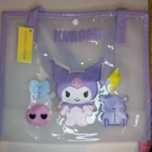 Clear vinyl tote bag featuring Kuromi design. Accented with purple handles and trim. Includes playful character graphics.