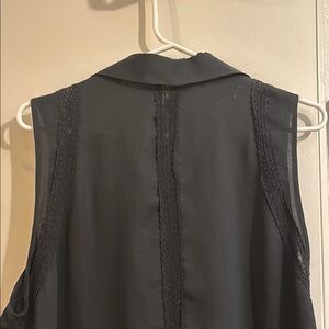 This black sleeveless top from CAbi features a notched collar and a boxy, buttoned design. Gently used and in new condition