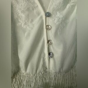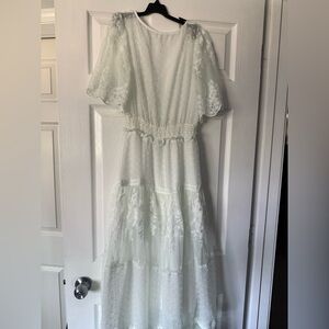 This enchanting white maxi dress showcases a charming V-neckline and flutter sleeves, making it perfect for a bridal occasion. The smocked waist enhances the silhouette, while the tiered skirt adds a touch of elegance and flow. Crafted from a light, airy fabric, it exudes a romantic and ethereal vibe.