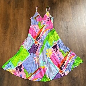 Beautiful and feminine ZARA floral midi dress in soft green, yellow, and blue hues. Made from floaty chiffon fabric, this dress features a flattering ruffled neckline, front slit, and a defined waist for an elegant silhouette.