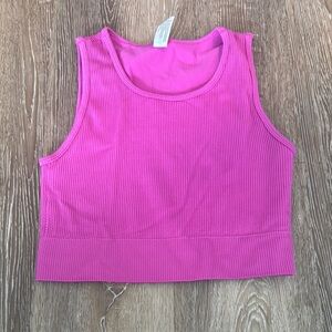 Vibrant pink ribbed tank top. Sleeveless design. Perfect for workouts or casual wear.