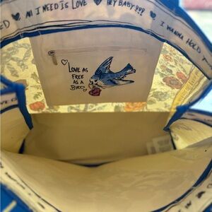 Brighton tote with a charming bird and heart design. Features 'Love as Free as a Bird' text. Blue and cream colors with floral accents.