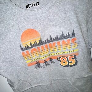Worn a couple of times! I prefer to have a baggier fit so did not wear much. Has super cute retro graphic featuring Hawkins 85 and the kids on their bicycles. Women's fit.