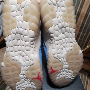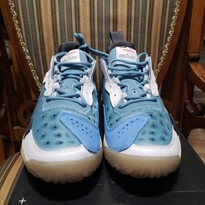 Stylish Jordan sneakers. Blue upper with white accents. Comfortable and trendy design.