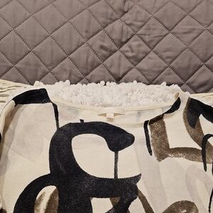 The Lisa Todd soft lightweight and oversized cotton/Cashmere sweater showcases a captivating cream base with bold black graphic "Love" designs, exuding a modern and artistic vibe. Its long sleeves and crew neckline offer a comfortable fit, making it a stylish choice for any occasion. Gently worn in excellent condition see all photos for details!