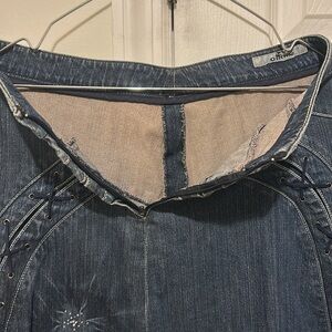 Denim midi skirt. Bought in Korea. Runs a bit big. In new condition, beautiful embroidery. Skirt is knee length.