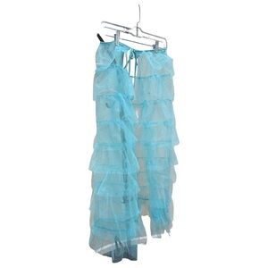 Float into the surreal. This sheer, multi-tiered ruffle skirt opens dramatically at the front, revealing the legs like a whispered secret. Crafted from lightweight, translucent mesh in a vivid turquoise hue, it dances with every step—perfect for layering over bodysuits, lace shorts, or ceremonial underpinnings.