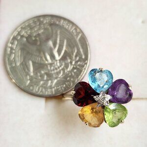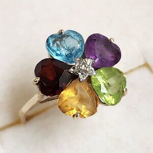 This Yellow Solid Gold Ring has One (1) Brilliant Cut Diamond (1.5mm) set in a White Gold in the center of Five (5) Fancy Heart Shaped Cut Genuine Gem Stones (3.5mm x 3mm each) -- Amethyst, Blue Topaz, Garnet, Citrine, and Peridot. All natural and ORIGINAL stones.