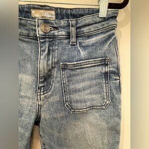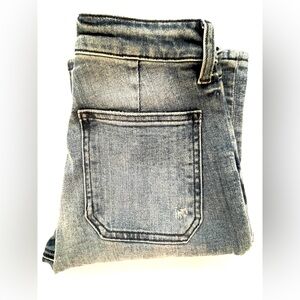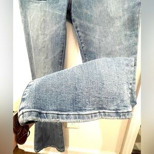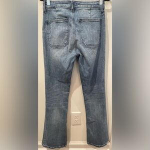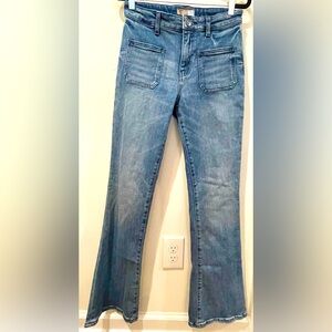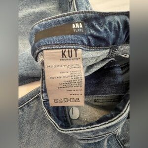 These jeans feature a flattering flare and wide leg design, crafted from a classic blue denim that offers a versatile and stylish look. The medium blue wash adds depth and dimension, making them perfect for any casual occasion. Enjoy the comfort and trendiness of these Kut from the Kloth jeans. Jeans are in great condition. Some of the photos make them look gray, but they are blue. Please see photos for all measurements.