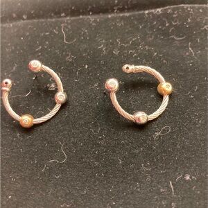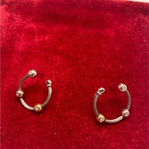 These stylish earrings showcase a minimalist design, crafted in a blend of silver and gold. The piercing hoops comfortably clip onto the ear, offering a modern and sophisticated look. Ideal for adding a touch of elegance to any ensemble.one post is missing