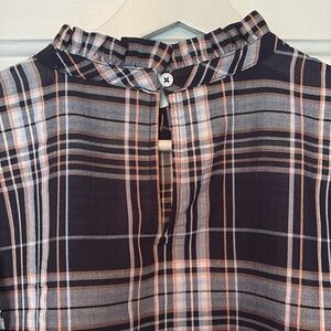 Never worn! Preppy Loft small plaid sleeveless pull over top w/cute neck & sleeve detail. Pit to pit 19”, overall length from shoulder approx 25”. Poly / rayon blend.