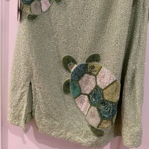 Elegant light green knit top with intricate beadwork. Ideal for a chic and stylish outfit.