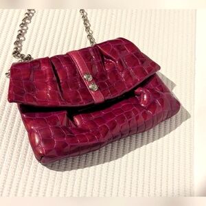 Fold over top with magnet closure Interior slip pocket Removable silver tone metal chain strap
