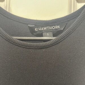This sleek black tank top from 41 Hawthorn features a fitted design with wide shoulder straps, making it ideal for layering or wearing solo. Its sleeveless style and classic crew neckline offer a versatile and timeless look.