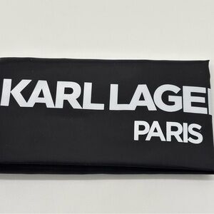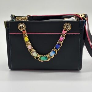 This Karl Lagerfeld crossbody bag combines a sleek black body with striking pink trim, enhanced by a vibrant multicolor chain strap. The structured design and gold-tone hardware add a touch of elegance, making it a standout accessory for any occasion.