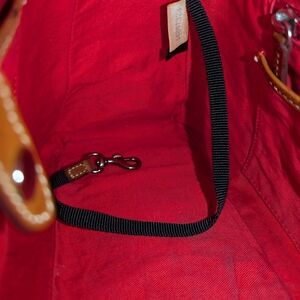 This Dooney & Bourke shoulder bag combines a vibrant purple pebble leather body with rich English Saddle leather accents, offering a stylish and durable accessory. Its classic silhouette and sturdy handles make it perfect for everyday use, while the eye-catching color contrast adds a touch of elegance.