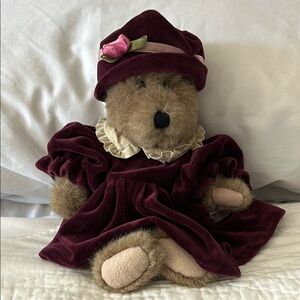 Adorable plush bear in a rich burgundy dress. Comes with a matching hat featuring a pink flower. Perfect for hugs and playtime. Arms and legs are movable. From a smoke free home - used just as decoration. The elastic on the arms of the dress has stretched out a bit from age.