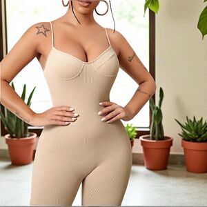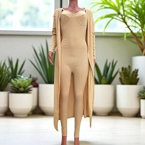 New 2 PIECE Apricot Rib-Knit Form Fitting Cami Jumpsuit With Long Cardigan