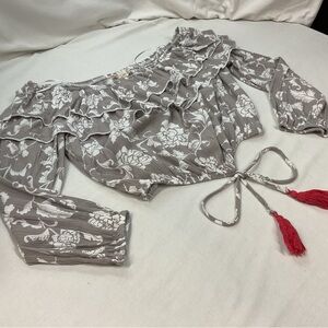 The Altar'd State Women's Gray/White Puff Sleeve Crop Top with Red Tassel Tie in size M is a stylish and versatile blouse perfect for casual occasions during the summer, fall, and spring seasons. The floral pattern and ruffle accents give it a bohemian theme, while the lightweight design makes it comfortable to wear. This pullover top features a trendy puff sleeve and a unique tassel tie detail, adding a touch of floral charm to your wardrobe.