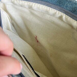 Vintage denim shoulder bag with metallic silver appliqué and zigzag stitching. Lined interior with zip top and minor staining inside (see photos). Classic ‘80s–’90s artisan vibe. Fair/good vintage condition