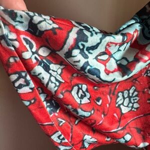 This relaxed tunic features a vibrant graphic design in blue and red, complemented by a mandarin collar and short sleeves. The flowing fabric and eye-catching pattern make it a perfect choice for casual outings or resort wear.