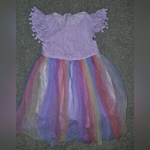 Adorable dress with a lace bodice and rainbow tulle skirt. Features pom-pom details on the sleeves. Super cute in great condition! Size 110.