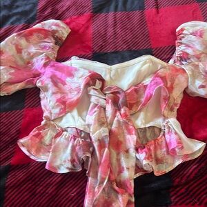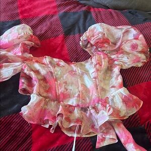 Elevate your style with this stunning floral puff sleeve top. Featuring a vibrant mix of pink and red hues, this top is perfect for any occasion. Enjoy the flattering fit and elegant design.