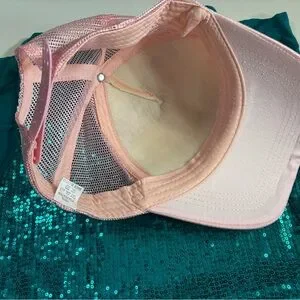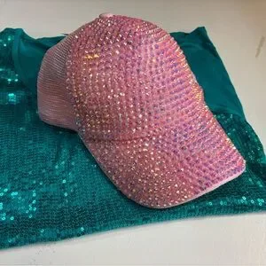 Excellent like new condition. Worn once for crazy hat day. No rips or stains. This dazzling pink hat features a baseball cap silhouette adorned with shimmering rhinestones and an adjustable strap in the back. The dense pattern of crystals on the front panel and bill is firm and sturdy.