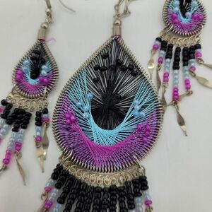 Bold, bright, and impossible to ignore, this vintage statement set features a large teardrop pendant and matching earrings woven with vivid thread in black, blue, magenta, and soft lavender. The beaded fringe swings freely beneath each piece, adding movement and flair. Spiraled silver-tone borders and long twisted dangles give the set that extra boho edge, perfect for festival wear or retro revival outfits. Lightweight but full of impact, the necklace hangs from a silver-tone triangle-link chain and the earrings feature matching fishhook wires. This set isn’t just jewelry, it’s a whole mood, ready to dance