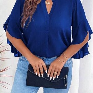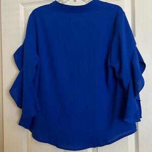 This royal blue blouse features three quarter length flutter sleeves and a ruffled design, complemented by a chic mandarin collar. Lightweight fabric and relaxed fit make it a versatile choice for both professional and casual settings. 100% polyester so it’s a slight stretch material. New without tags.