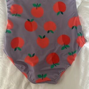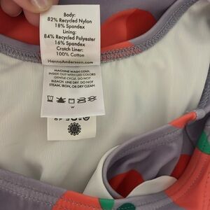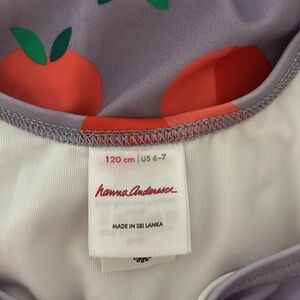 Hanna Andersson One-Piece Ruffle Strap Swimsuit. Purple with two-tone all-over apple print. Ruffle accent to straps. Crafted from recycled materials. Nylon/spandex/cotton. Oeko-Tex Standard 100 certified safe from hundreds of harsh chemicals. Size 6-7 or 120. EUC