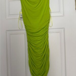 Step out in style with this striking green mini dress from AFRM, designed with a flattering ruched texture and a sophisticated bateau neckline. The cap sleeves add a touch of elegance, making it an ideal choice for a night out or cocktail event. Its bodycon fit ensures a sleek silhouette, perfect for making a bold statement.