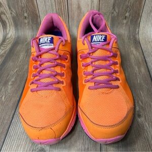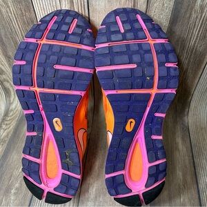 Vibrant orange Nike athletic shoes with purple accents. Comfortable and stylish for workouts.