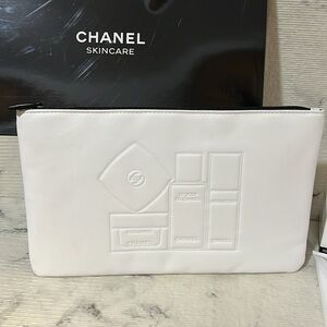 • Chanel Skincare Pouch, white puffy texture, rectangular shape, Chanel skincare embossed on one side and Chanel cosmetics design on the other side