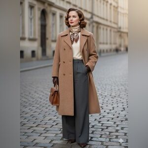 Step back into mid-century sophistication with this stunning vintage 1960s double-breasted trench coat. Crafted from a heavy, high-quality 70% wool blend in a timeless camel tan hue, this coat features a dramatic wide collar and classic gold-tone button detailing. The silhouette is defined by an elegant back martingale belt with gold hardware accents, offering a polished "old money" aesthetic that remains effortlessly stylish today. This authentic piece carries the ILGWU (International Ladies' Garment Workers' Union) label, a hallmark of quality American craftsmanship from a bygone era.