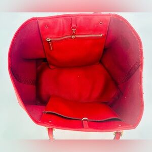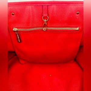 Vibrant red interior with gold zipper. Michael Kors branding on tag.