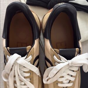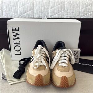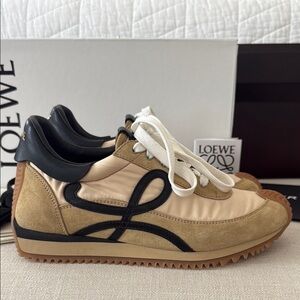 Stylish Loewe sneakers in tan and black. Perfect for everyday wear. Worn a dozen or so times, they show very little normal wear. The bottoms look nearly unworn. Size 37. Purchased from NET-A-PORTER and will come with all original packaging including 2 dust bags and black laces. Price is firm.