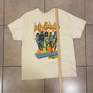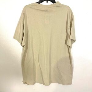 Beige tee with bold graphic. Features vibrant design. Casual and stylish.