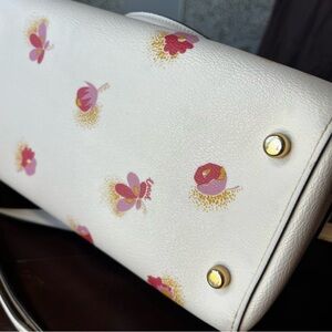 This Coach Rowan Pop Floral satchel bag features a charming white and pink floral design, offering a structured silhouette with a polished finish. No bag tag included.