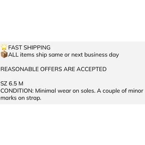 CONDITION: Minimal wear on soles. A couple of minor marks on strap.