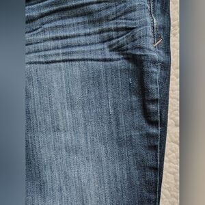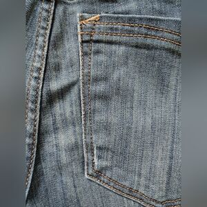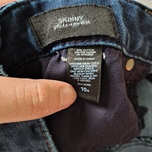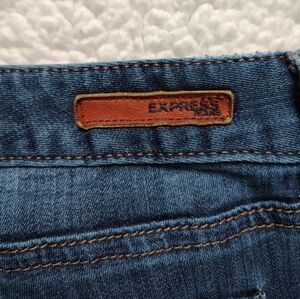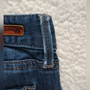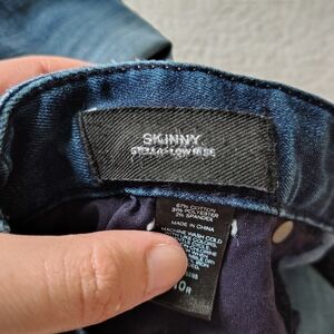 Express brand women's size 10 regular Stella skinny low-rise jeans. Jeans are pre-owned, but still in good shape overall. There is some fraying/thinning sporadically throughout the jeans (pockets, knee area, etc), and I included pictures of what I could find when I looked the jeans over before posting. Other than that, the jeans are still great and very comfortable. They are labelled as skinny, but they aren't skinny at the ankles like is typical - they remind me more of a straight or boot cut.